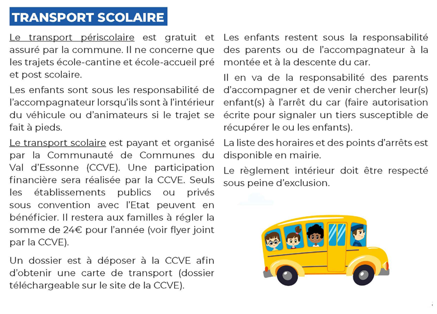 Pour toute information complémentaire sur les transports scolaires, vous pouvez consulter la page internet du site de la CCVE : https://valessonne.fr/pages/des-transports-adaptes-pour-tous ou contacter directement le service transport de la CCVE au 01 64 93 21 20 (touche 4) ou transport@ccvalessonne.com.